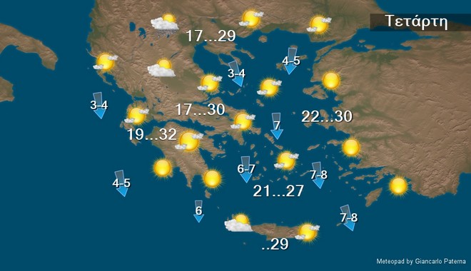 Οι άνεμοι θα πνέουν από βόρειες διευθύνσεις στα δυτικά 3 με 5, στα ανατολικά 4 με 6 και στο Αιγαίο 7 και τοπικά 8 μποφόρ με εξασθένηση από το απόγευμα .Η θερμοκρασία σε κανονικά επίπεδα θα φτάσει τους 28 με 30 και τοπικά στα δυτικά και νότια τους 31 με 32 βαθμούς Κελσίου.
