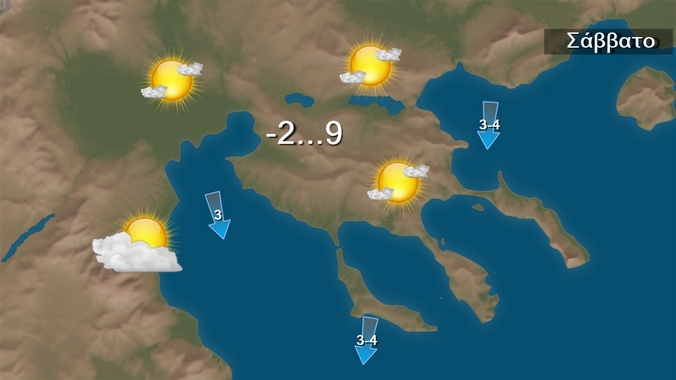Το Σάββατο προβλέπεται σχετικά βελτιωμένος καιρός με τοπικές νεφώσεις στα ανατολικά και τα νότια και πρόσκαιρες βροχές στις Κυκλάδες, την Κρήτη και πιθανόν στα Δωδεκάνησα και λίγα χιόνια στα ορεινά. Οι άνεμοι θα πνέουν βόρειοι βορειοανατολικοί, στα δυτικά και τα βόρεια 4 με 5 μποφόρ, στα υπόλοιπα 5 με 6 και τοπικά στα νότια 7 μποφόρ, με εξασθένηση από το μεσημέρι. Η θερμοκρασία δεν θα σημειώσει αξιόλογη μεταβολή.
