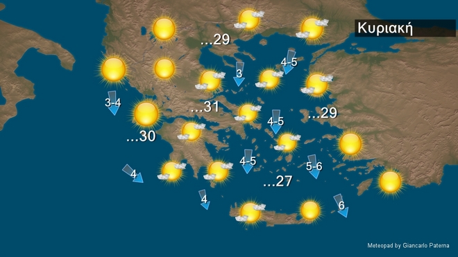διευθύνσεις 3 με 4 και στο Αιγαίο τοπικά 5 με 6 μποφόρ. Η θερμοκρασία δεν θα σημειώσει αξιόλογη μεταβολή. Στα ηπειρωτικά η μέγιστη θα φτάσει τους 29 με 31 βαθμούς Κελσίου και στα νησιά τους 26 με 29 βαθμούς.
