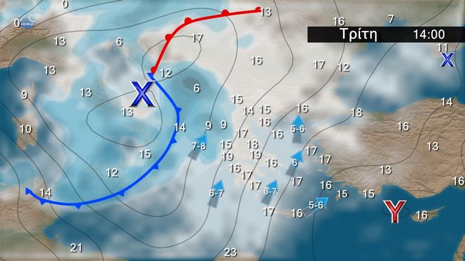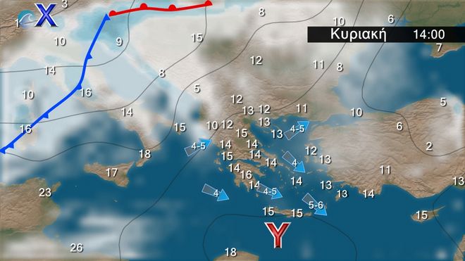 Στην ανατολική νησιωτική χώρα νεφώσεις με βροχές και σποραδικές καταιγίδες, βελτίωση από το μεσημέρι. Στις υπόλοιπες περιοχές γενικά αίθριος με αραιές νεφώσεις από το απόγευμα. Οι άνεμοι θα πνέουν βόρειοι βορειοδυτικοί, στα δυτικά 5 με 7 μποφόρ με γρήγορη εξασθένηση, στα ανατολικά 6 με 8 μποφόρ με εξασθένηση από το μεσημέρι στα κεντρικά και τα βόρεια και από το βράδυ στις υπόλοιπες περιοχές. Η θερμοκρασία θα σημειώσει πτώση στα ανατολικά.