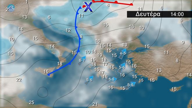 Γενικά αίθριος με λίγες νεφώσεις στα δυτικά και τα βόρεια, οι οποίες το βράδυ θα αυξηθούν και στο βόρειο Ιόνιο και την Ήπειρο θα σημειωθούν βροχές. Τοπικά περιορισμένη ορατότητα τις πρωινές ώρες κυρίως στα δυτικά. Οι άνεμοι θα πνέουν στα νοτιοανατολικά βορειοδυτικοί 4 με 5 πρόσκαιρα έως 6 μποφόρ. Στην υπόλοιπη χώρα από νότιες διευθύνσεις 3 με 5 και από το απόγευμα στο βόρειο Ιόνιο 6 μποφόρ.