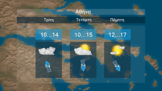 Στην Αθήνα προβλέπονται τοπικές νεφώσεις . Η θερμοκρασία θα έχει μέγιστες τιμές περί τους 14 με 17 βαθμούς Κελσίου.