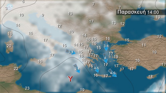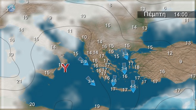 Γενικά αίθριος καιρός με αραιές νεφώσεις κατά διαστήματα. Τοπικά περιορισμένη ορατότητα τις πρωινές και βραδινές ώρες στα ηπειρωτικά. Οι άνεμοι θα πνέουν από δυτικές διευθύνσεις 3 με 5 πρόσκαιρα στα νότια 6 μποφόρ. Η θερμοκρασία θα σημειώσει άνοδο. 8 BALKANS RAIN