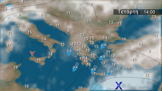 Την Τετάρτη, στα ανατολικά και τα νότια λίγες νεφώσεις θα υπάρξουν παροδικά αυξημένες με τοπικές βροχές μικρής διάρκειας και στα νησιά του ανατολικού Αιγαίου και τα Δωδεκάνησα σποραδικές καταιγίδες. Βελτίωση τις βραδινές ώρες. Στην υπόλοιπη χώρα λίγες παροδικές νεφώσεις. Τοπικά περιορισμένη ορατότητα τις πρωινές και βραδινές ώρες στα ηπειρωτικά. Οι άνεμοι θα πνέουν από βόρειες διευθύνσεις 3 με 4 και στο νοτιοανατολικό Αιγαίο ανατολικοί νοτιοανατολικοί 4 με 5 πρόσκαιρα 6 μποφόρ. Η θερμοκρασία δεν θα σημειώσει αξιόλογη μεταβολή.