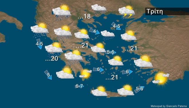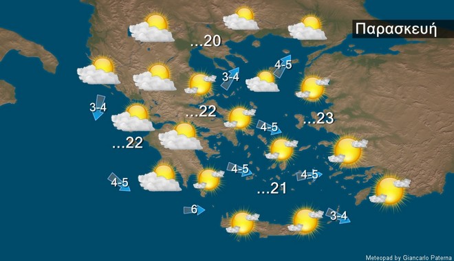 Στα δυτικά λίγες νεφώσεις κατά διαστήματα αυξημένες, με πιθανότητα τοπικών βροχών μέχρι το απόγευμα. Στις υπόλοιπες περιοχές γενικά αίθριος καιρός με πρόσκαιρες νεφώσεις στα ηπειρωτικά τις μεσημβρινές – απογευματινές ώρες, οπότε είναι πιθανό να σημειωθούν τοπικές βροχές ή πρόσκαιροι όμβροι στα βόρεια. Οι άνεμοι θα πνέουν από δυτικές διευθύνσεις 3 με 5 και πρόσκαιρα στα νότια τοπικά 6 μποφόρ. Από το βράδυ στα βόρεια θα στραφούν σε νοτίων διευθύνσεων 3 με 5 μποφόρ. Η θερμοκρασία δεν θα σημειώσει αξιόλογη μεταβολή.