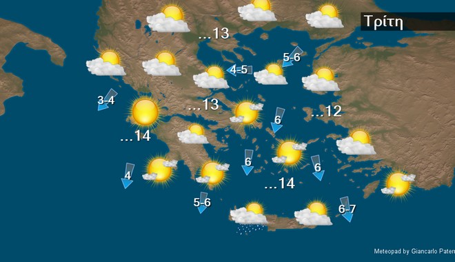 Τις μεσημβρινές ώρες στα δυτικά θα στραφούν σε δυτικούς βορειοδυτικούς 3 με 4 μποφόρ. Η θερμοκρασία θα σημειώσει μικρή άνοδο και θα φτάσει στα βόρεια τους 11 με 13 βαθμούς, στα υπόλοιπα τους 13 με 15 βαθμούς Κελσίου. Παγετός θα σημειωθεί στα κεντρικά και βόρεια ηπειρωτικά τις πρωινές και βραδινές ώρες.