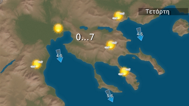 Οι άνεμοι θα πνέουν από βόρειες διευθύνσεις στα δυτικά 3 με 5 μποφόρ, στα ανατολικά 5 με 7, και στο Αιγαίο 8 με 9 μποφόρ με σταδιακή εξασθένηση. Η θερμοκρασία θα σημειώσει μικρή άνοδο ως προς τις μέγιστες τιμές στα δυτικά και βόρεια, όμως παγετός θα σημειωθεί κατά τόπους στα ηπειρωτικά τις πρωινές και βραδινές ώρες, κατά τόπους ισχυρός στα κεντρικά και βόρεια. Στα βόρεια ο υδράργυρος δεν θα ξεπεράσει τους 9 βαθμούς, στα υπόλοιπα ηπειρωτικά και το Ιόνιο θα φτάσει τους 8 με 13 βαθμούς και στο Αιγαίο τους 9 με 14 βαθμούς Κελσίου.