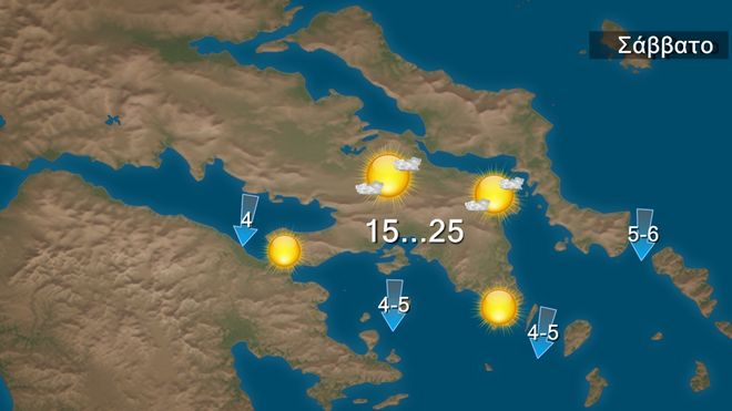 Σήμερα Σάββατο θα επικρατήσει γενικά αίθριος καιρός με μικρή πιθανότητα για τοπικές βροχές στα βορειοανατολικά τις πρωινές και στην Πελοπόννησο το απόγευμα. Οι άνεμοι θα πνέουν από βόρειες διευθύνσεις 3 με 5, στο Αιγαίο 6 και στα νοτιοανατολικά τοπικά 6 με 7 μποφόρ. Η θερμοκρασία θα σημειώσει μικρή άνοδο στο Ιόνιο και τα ηπειρωτικά  και θα έχει μέγιστη τιμή στα βόρεια τους 24 βαθμούς στα υπόλοιπα ηπειρωτικά και το Ιόνιο τους 25 με 26 και  στα νησιά του Αιγαίου τους 23 με 24 βαθμούς Κελσίου.