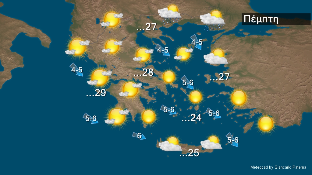 Οι άνεμοι θα πνέουν στα δυτικά, τα κεντρικά και τα νότια δυτικοί βορειοδυτικοί 3 με 5 και στα πελάγη τοπικά 6 και από το απόγευμα πρόσκαιρα 7 μποφόρ. Στις υπόλοιπες περιοχές θα πνέουν νότιοι 3 με 5 και από το απόγευμα βαθμιαία βόρειοι βορειοδυτικοί και θα ενισχυθούν. Η θερμοκρασία δεν θα σημειώσει αξιόλογη μεταβολή.
