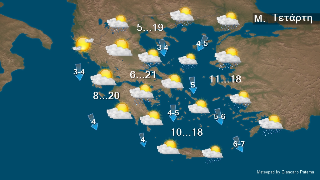 Την Μεγάλη Τετάρτη προβλέπεται βελτιωμένος καιρός με λίγες τοπικές βροχές στα ανατολικά. Οι άνεμοι θα πνέουν δυτικοί βορειοδυτικοί 3 με 5 και στα νότια 5 με 7 μποφόρ με βαθμιαία εξασθένηση . Η θερμοκρασία θα σημειώσει άνοδο και θα φτάσει στα ηπειρωτικά τους 19 με 21 βαθμούς και στις νησιωτικές περιοχές τους 18 βαθμούς Κελσίου.