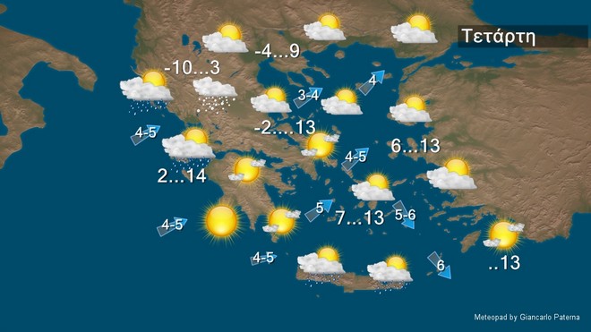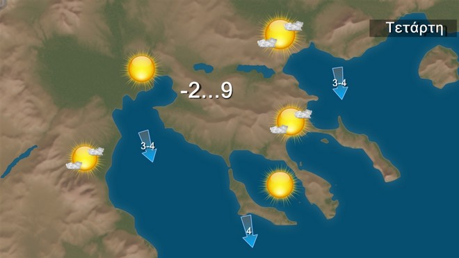 Την Τετάρτη στις Κυκλάδες και την Κρήτη τις πρωινές ώρες παροδικά αυξημένες νεφώσεις με λίγες ασθενείς βροχές, στα ορεινά της Κρήτης ασθενείς χιονοπτώσεις και γρήγορη βελτίωση. Στην υπόλοιπη χώρα γενικά αίθριος καιρός με λίγες νεφώσεις στα δυτικά που βαθμιαία θα αυξηθούν και τις βραδινές ώρες στα βορειοδυτικά θα σημειωθούν τοπικές βροχές και στα ηπειρωτικά ορεινά παροδικές χιονοπτώσεις. Οι άνεμοι θα πνέουν αρχικά από βόρειες διευθύνσεις 3 με 5 και στα νοτιοανατολικά 5 με 7, γρήγορα όμως θα στραφούν σε δυτικούς νοτιοδυτικούς 4 με 5 μποφόρ. Η θερμοκρασία θα σημειώσει άνοδο κυρίως ως προς τις μέγιστες τιμές της, όμως παγετός θα σημειωθεί στα ηπειρωτικά τις πρωινές και βραδινές ώρες, κατά τόπους ισχυρός στα βόρεια. Η θερμοκρασία θα έχει μέγιστη τιμή στα βόρεια τους 9 βαθμούς, στα υπόλοιπα ηπειρωτικά και το Ιόνιο τους 13 με 14 βαθμούς Κελσίου, στις Κυκλάδες και την Κρήτη τους 13 βαθμούς και στο Ανατολικό Αιγαίο και τα Δωδεκάνησα τους 13 βαθμούς Κελσίου.
