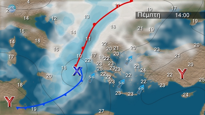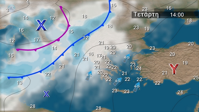 Νεφώσεις με τοπικές βροχές και σποραδικές καταιγίδες αρχικά στα δυτικά και βαθμιαία και στις υπόλοιπες περιοχές. Τα φαινόμενα, που θα είναι πιθανώς κατά τόπους ισχυρά στα δυτικά, από το βράδυ βαθμιαία θα εξασθενήσουν. Ευνοείται η μεταφορά σκόνης κυρίως στα κεντρικά και τα νότια. Οι άνεμοι θα πνέουν νότιοι νοτιοανατολικοί 4 με 6 και στα πελάγη τοπικά 7 μποφόρ. Από το απόγευμα στα δυτικά θα στραφούν σε δυτικούς νοτιοδυτικούς 3 με 5 μποφόρ. Η θερμοκρασία σε μικρή πτώση στα δυτικά ως προς τις μέγιστες τιμές.