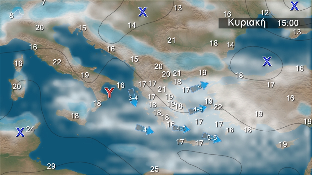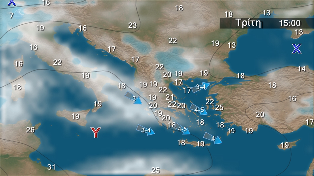 Στα κεντρικά και βόρεια γενικά αίθριος καιρός, όμως τις μεσημβρινές και απογευματινές ώρες θα αναπτυχθούν νεφώσεις και θα εκδηλωθούν τοπικοί όμβροι στα ηπειρωτικά ορεινά κυρίως της Μακεδονίας και της Θράκης. Στην υπόλοιπη χώρα αρχικά αίθριος καιρός, γρήγορα όμως από τα νοτιοδυτικά θα αναπτυχθούν αραιές νεφώσεις και υπάρχει πιθανότητα ασθενών τοπικών βροχών στην Κρήτη.Τοπικά περιορισμένη ορατότητα τις πρωινές και βραδινές ώρες στα ηπειρωτικά.Οι άνεμοι θα πνέουν δυτικοί νοτιοδυτικοί 3 με 4 και στα νότια τοπικά 5 με 6 μποφόρ.Η θερμοκρασία θα επανέλθει στα κανονικά για την εποχή επίπεδα.