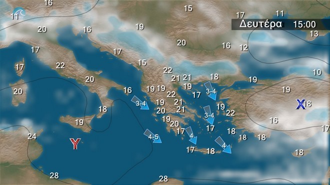 Γενικά αίθριος καιρός, με λίγες πρόσκαιρες νεφώσεις στα ηπειρωτικά-ορεινά τις απογευματινές ώρες. Τοπικά περιορισμένη ορατότητα στα βορειοδυτικά τις βραδινές ώρες.Οι άνεμοι θα πνέουν βορειοδυτικοί 3 με 5 και στα νοτιοανατολικά τοπικά 6 μποφόρ. Βαθμιαία στα δυτικά, κεντρικά και βόρεια θα στραφούνσε δυτικούς νοτιοδυτικούς με την ίδια ένταση. Η θερμοκρασία θα σημειώσει άνοδο κυρίως ως προς τις μέγιστες τιμές της.