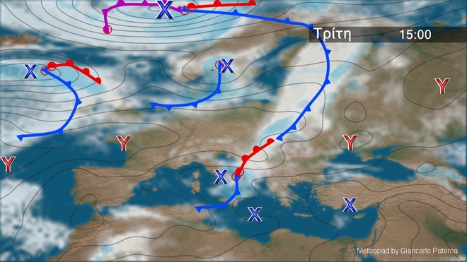 Στον γενικό χάρτη της Ευρώπης διακρίνονται τα χαμηλά που επηρεάζουν την Κεντρική και Βορειοδυτική Ευρώπη . Το σύστημα που βρίσκεται στην περιοχή της Ιταλίας παραμένει σχεδόν στάσιμο και δεν προβλέπεται να μας επηρεάσει σημαντικά .