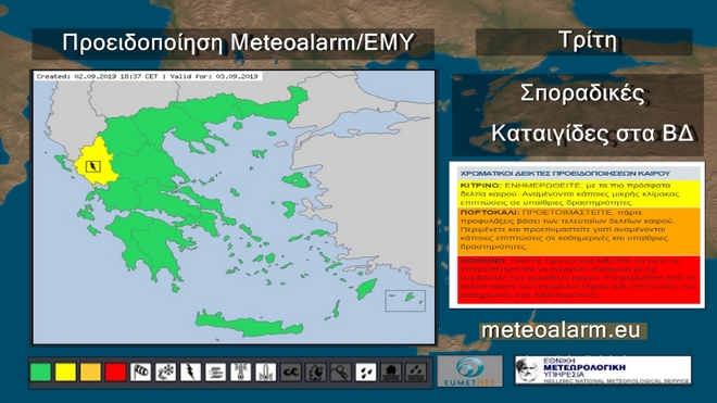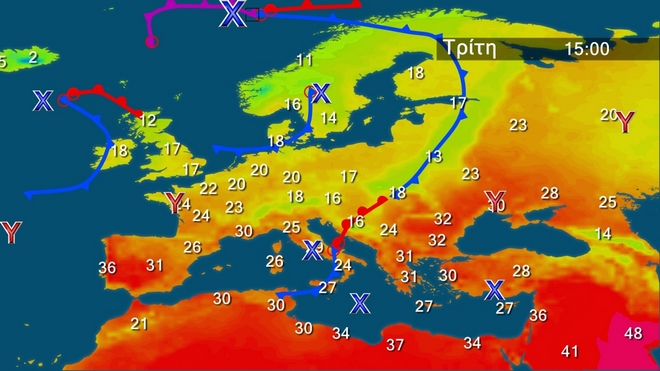 Την Τρίτη στα δυτικά προβλέπονται λίγες νεφώσεις παροδικά αυξημένες και τις μεσημβρινές και απογευματινές ώρες θα σημειωθούν σποραδικοί όμβροι και πιθανώς μεμονωμένες καταιγίδες στα ορεινά των ηπειρωτικών περιοχών. Στην υπόλοιπη χώρα γενικά αίθριος με τοπικές νεφώσεις στα ηπειρωτικά κυρίως τις μεσημβρινές και απογευματινές ώρες. Οι άνεμοι θα πνέουν στα δυτικά βορειοδυτικοί 3 με 4 στα νότια 4 με 5 και στα ανατολικά από βόρειες διευθύνσεις 4 με 6 μποφόρ. Η θερμοκρασία δεν θα σημειώσει αξιόλογη μεταβολή. και θα φτάσει στα βόρεια και τα υπόλοιπα ηπειρωτικά τους 34 με 35 βαθμούς, στις Κυκλάδες τους 29 στη νότια Κρήτη τους 32 και στο Ανατολικό Αιγαίο τους 33 βαθμούς Κελσίου