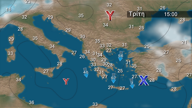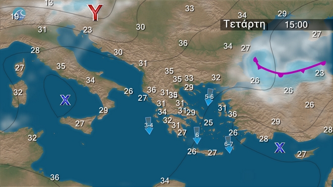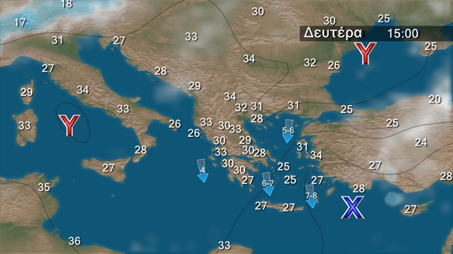 Την Κυριακή προβλέπεται γενικά αίθριος καιρός. Πρόσκαιρες νεφώσεις θα αναπτυχθούν στα ηπειρωτικά τις μεσημβρινές και απογευματινές ώρες. Οι άνεμοι θα πνέουν από βόρειες διευθύνσεις, στα δυτικά και τα βόρεια 3 με 4, στις υπόλοιπες περιοχές 5 με 7 και στο Αιγαίο τοπικά στα νοτιοανατολικά 8 μποφόρ. Η θερμοκρασία δεν θα σημειώσει αξιόλογη μεταβολή και δεν θα ξεπεράσει τους 33 με 34 βαθμούς