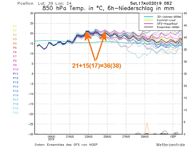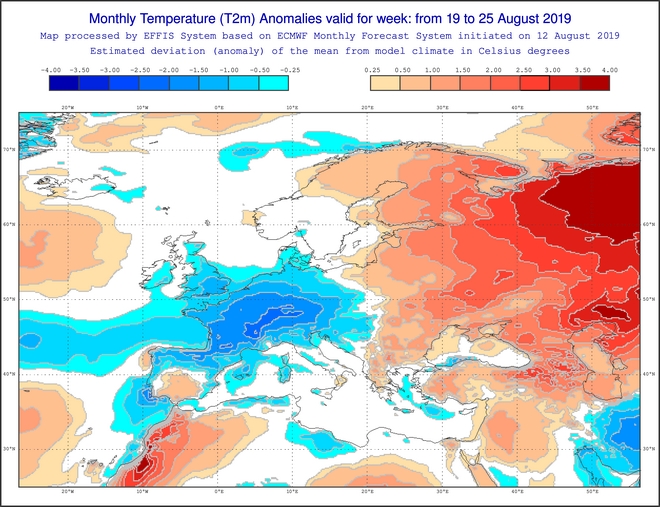 Η μικρή άνοδος της θερμοκρασίας στη χώρα μας από τα μέσα της ερχόμενης εβδομάδος αποτυπώνεται και στην εβδομαδιαία τάση της θερμοκρασίας από 19 έως και 25 Αυγούστου κυρίως για τα ηπειρωτικά τμήματα . Στην ανατολική νησιωτική χώρα θα επικρατήσουν λίγο χαμηλότερες θερμοκρασίες από τα κανονικά επίπεδα. Πολύ χαμηλές θερμοκρασίες θα έχει η Δυτική και κεντρική Ευρώπη