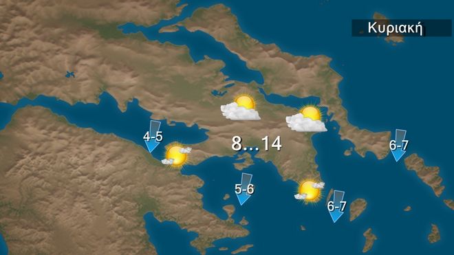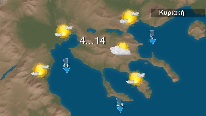 Για την Κυριακή ο καιρός θα παρουσιάσει σταδιακή βελτίωση σχεδόν σε όλη τη χώρα . Στα ανατολικά και νότια προβλέπονται παροδικά αυξημένες νεφώσεις με τοπικές βροχές κυρίως στην Κρήτη. Στην υπόλοιπη χώρα θα επικρατήσει γενικά αίθριος καιρός .Οι βόρειοι άνεμοι στο Αιγαίο θα φτάνουν αρχικά τα 7 με 8 μποφόρ με μικρή εξασθένηση από το βράδυ. Η θερμοκρασία σε καλά επίπεδα θα έχει μέγιστη τιμή στα βόρεια τους 14 βαθμούς, στα υπόλοιπα ηπειρωτικά και το Ιόνιο τους 15 με 17 βαθμούς και στο Αιγαίο τους 15 με 16 βαθμούς Κελσίου.