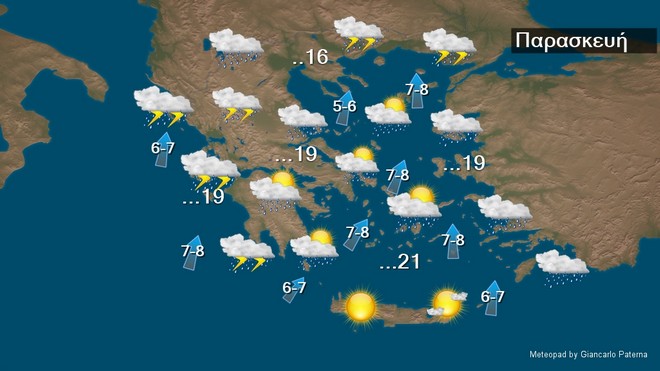 ηπειρωτικά και στο ανατολικό Αιγαίο και θα εξασθενήσουν. Οι άνεμοι θα πνέουν δυτικοί νοτιοδυτικοί 5 με 7 και στα πελάγη 8 μποφόρ, που γρήγορα στα δυτικά και βαθμιαία στην υπόλοιπη χώρα θα στραφούν σε βορειοδυτικούς και από το βράδυ σταδιακά θα εξασθενήσουν. Η θερμοκρασία θα παρουσιάσει αισθητή πτώση κυρίως στο Ιόνιο και τα ηπειρωτικά. Θα φτάσει στα βόρεια έως τους 13 βαθμούς, στο Ιόνιο και τα υπόλοιπα ηπειρωτικά έως τους 14 με 16 και στο Αιγαίο έως τους 19