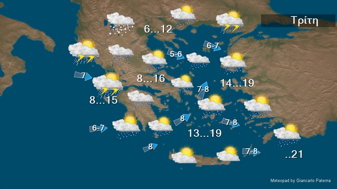 Σήμερα Τρίτη προβλέπονται νεφώσεις με βροχές και σποραδικές καταιγίδες, κατά τόπους έντονες στα δυτικά και βόρεια τις πρωινές ώρες.