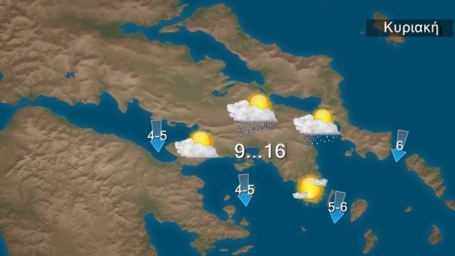 Την Κυριακή προβλέπονται νεφώσεις παροδικά αυξημένες με τοπικές βροχές στα ανατολικά και βόρεια ηπειρωτικά, τις Σποράδες, την Εύβοια, τις Κυκλάδες και τη βόρεια Κρήτη. Από το μεσημέρι τοπικές βροχές θα σημειωθούν και στα δυτικά. Λίγα χιόνια θα σημειωθούν στα κεντρικά και βόρεια ορεινά. Το βράδυ τα φαινόμενα θα περιοριστούν στα δυτικά. Οι άνεμοι θα πνέουν βόρειοι βορειοανατολικοί 4 με 5, στα ανατολικά 5 με 6 και πρόσκαιρα τις πρωινές ώρες στο βόρειο Αιγαίο έως 7 μποφόρ. Η θερμοκρασία θα σημειώσει πτώση στα κεντρικά και τα βόρεια κατά 4 με 5 βαθμούς και θα έχει μέγιστη τιμή στα βόρεια τους 11 βαθμούς, στα υπόλοιπα ηπειρωτικά και το Ιόνιο τους 16 με 17 βαθμούς Κελσίου, στις Κυκλάδες, και την Κρήτη τους 18 βαθμούς και στο Ανατολικό Αιγαίο και Δωδεκάνησα τους 18 βαθμούς Κελσίου.