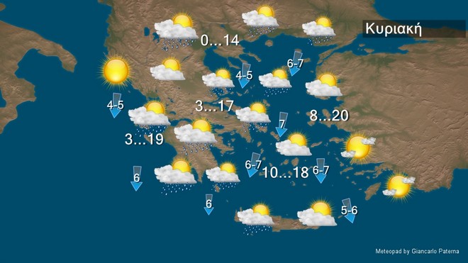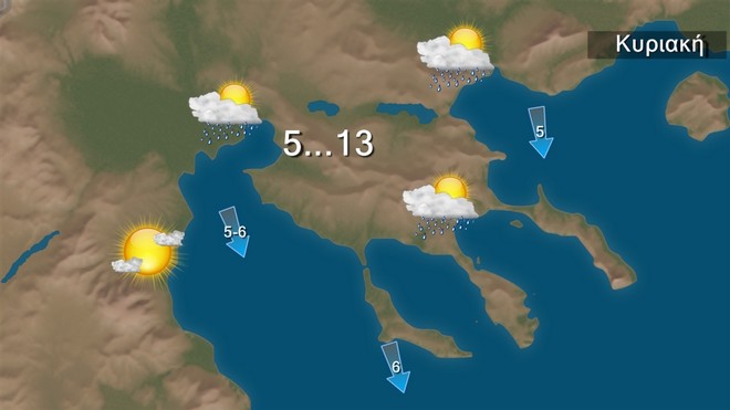 Την Κυριακή προβλέπονται νεφώσεις με τοπικές βροχές, τις πρωινές ώρες στην ανατολική Μακεδονία και τη Θράκη, μέχρι και το απόγευμα στην κεντρική Μακεδονία, την ανατολική Θεσσαλία, τις Σποράδες, την Εύβοια και την ανατολική Στερεά, από τις μεσημβρινές ώρες βαθμιαία στην Πελοπόννησο, τις Κυκλάδες, τη βόρεια Κρήτη και τα νοτιότερα τμήματα του Ιονίου. Λίγες παροδικές χιονοπτώσεις θα σημειωθούν στα βόρεια ηπειρωτικά ορεινά. Οι άνεμοι θα πνέουν, στα δυτικά ανατολικοί βορειοανατολικοί 4 με 6 πρόσκαιρα τοπικά 7 μποφόρ και στα ανατολικά βόρειοι βορειοανατολικοί 5 με 7 μποφόρ με τάση ενίσχυσης Η θερμοκρασία θα σημειώσει πτώση, κυρίως ως προς τις μέγιστες τιμές της, η οποία στην κεντρική και τη βόρεια χώρα θα είναι αισθητή και θα φτάσει στα βόρεια τους 14 βαθμούς, στα υπόλοιπα ηπειρωτικά και το Ιόνιο τους 17 με 19 βαθμούς Κελσίου, στις Κυκλάδες, και την Κρήτη τους 18 βαθμούς και στο Ανατολικό Αιγαίο και Δωδεκάνησα τους 20 βαθμούς Κελσίου.