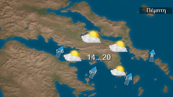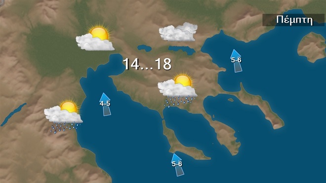 Την Πέμπτη στα δυτικά και τα βόρεια προβλέπονται νεφώσεις με βροχές και στα δυτικά σποραδικές καταιγίδες, πιθανώς κατά τόπους ισχυρές στα βορειοδυτικά. Στην υπόλοιπη χώρα λίγες νεφώσεις παροδικά αυξημένες με λίγες τοπικές βροχές κυρίως στο ανατολικό Αιγαίο. Xιόνια θα πέσουν στα βορειοδυτικά ορεινά. Ευνοείται η μεταφορά σκόνης κυρίως στα δυτικά.
