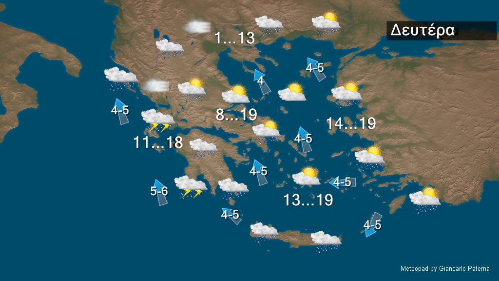 Τη Δευτέρα προβλέπεται  σταδιακή μεταβολή του καιρού από αργά το βράδυ και από τα νοτιοδυτικά με κύρια χαρακτηριστικά τις βροχές και καταιγίδες που κατά τη διάρκεια της νύχτας θα επηρεάσουν τα υπόλοιπα δυτικά και τα νότια τμήματα της χώρας και πιθανώς θα είναι τοπικά ισχυρές.