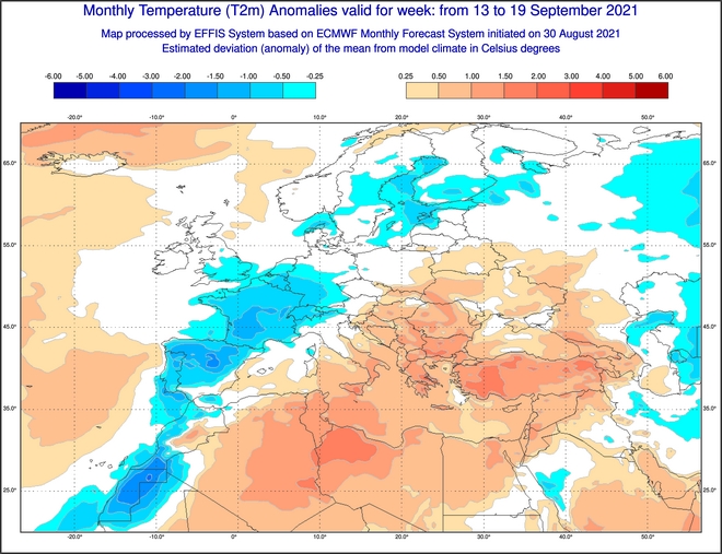 Στην Αθήνα οι θερμοκρασίες θα βρίσκονται λίγο κάτω από τα κανονικά επίπεδα για τις επόμενες 4 με 5 ημέρες του Σεπτεμβρίου, ενώ αργότερα, δηλαδή μετά το πρώτο δεκαήμερο του μήνα, θα έχουμε κανονικές ή λίγο πάνω από τις κανονικές θερμοκρασίες όπως φαίνεται στο παραπάνω μετεώγραμμα. Στο ίδιο συμπέρασμα καταλήγουμε και για όλη τη χώρα στους δύο χάρτες που ακολουθούν , οι οποίοι μας δίνουν την συνολική εικόνα των θερμοκρασιών ανά εβδομάδα .