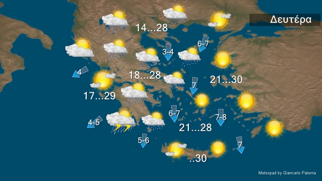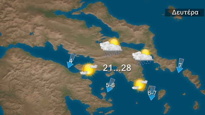 Σήμερα Δευτέρα τοπικές βροχές προβλέπονται στη δυτική, την κεντρική Μακεδονία, τη Θεσσαλία, την ανατολική Στερεά, τις Σποράδες, την Εύβοια, καθώς και στο νότιο Ιόνιο και τη νοτιοδυτική Πελοπόννησο όπου θα εκδηλωθούν και μεμονωμένες καταιγίδες. Στην υπόλοιπη χώρα θα υπάρχουν τοπικές νεφώσεις . Οι άνεμοι θα πνέουν βορειοανατολικοί στα ανατολικά 5 με 7 και τοπικά 8 μποφόρ με τάση περαιτέρω ενίσχυσης τη νύχτα στο βόρειο Αιγαίο. Η θερμοκρασία θα σημειώσει πτώση στα ανατολικά και στα δυτικά, τα Δωδεκάνησα και τη νότια Κρήτη θα φτάσει μέχρι 29 με 30 βαθμούς, στα υπόλοιπα 25 με 28 βαθμούς Κελσίου .