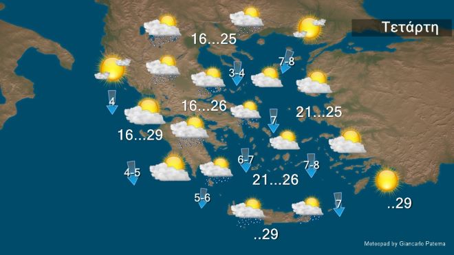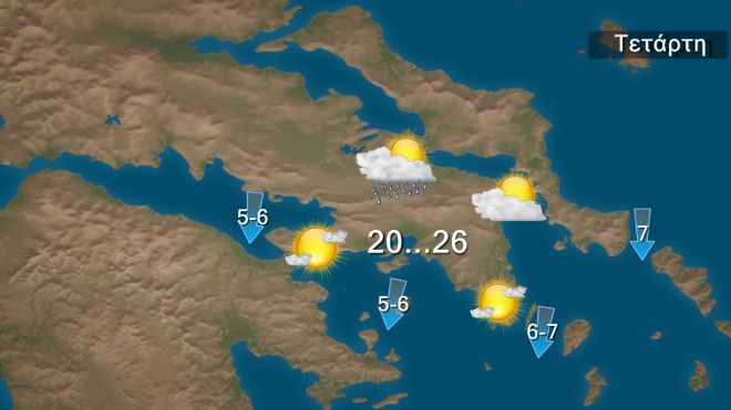 Σήμερα Τετάρτη στην κεντρική Μακεδονία, τα ανατολικά και νότια ηπειρωτικά, την Εύβοια, τις Σποράδες και την Κρήτη προβλέπονται τοπικές βροχές και μεμονωμένες καταιγίδες. Στην υπόλοιπη χώρα θα υπάρχουν παροδικές νεφώσεις. Οι άνεμοι θα πνέουν βόρειοι βορειοανατολικοί που σταδιακά θα εξασθενήσουν και μόνο τοπικά στο Αιγαίο θα φτάσουν πρόσκαιρα έως 8 μποφόρ. Η θερμοκρασία δεν θα σημειώσει αξιόλογη μεταβολή και θα παραμείνει σε χαμηλά επίπεδα και στα δυτικά, τα Δωδεκάνησα και τη νότια Κρήτη θα φτάσει μέχρι 29 βαθμούς και στα υπόλοιπα 25 με 26 βαθμούς Κελσίου .