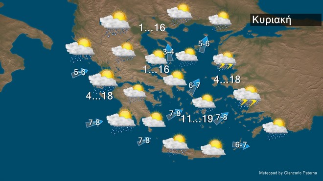 Στα δυτικά, την ανατολική Μακεδονία, τη Θράκη καθώς και τα νησιά του βόρειου και ανατολικού Αιγαίου βροχές και σποραδικές καταιγίδες που πιθανόν να είναι κατά τόπους ισχυρές. Στην υπόλοιπη χώρα νεφώσεις παροδικά αυξημένες με πρόσκαιρες βροχές και στην ανατολική Στερεά, την ανατολική Πελοπόννησο και τις Κυκλάδες μικρής διάρκειας καταιγίδες. Λίγα χιόνια θα πέσουν στα ορεινά της Ηπείρου και της δυτικής Μακεδονίας. Οι άνεμοι θα πνέουν από νότιες διευθύνσεις 5 με 6 και τοπικά στο Αιγαίο 7 με 8 μποφόρ με μικρή εξασθένηση από το απόγευμα. Η θερμοκρασία θα σημειώσει μικρή πτώση.