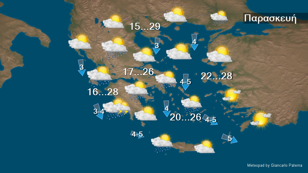 Σήμερα Παρασκευή προβλέπεται άστατος καιρός με τοπικές βροχές και σποραδικές καταιγίδες αρχικά στα ανατολικά και τα νότια και τις μεσημβρινές και απογευματινές ώρες στα δυτικά. Βελτίωση το βράδυ. Οι άνεμοι στα δυτικά θα είναι μεταβλητοί ασθενείς και στα ανατολικά θα πνέουν από βόρειες διευθύνσεις 3 με 5 μποφόρ. Η θερμοκρασία δεν θα σημειώσει αξιόλογη μεταβολή και θα φτάσει τους 26 με 28 βαθμούς και κατά τόπους τους 29 βαθμούς Κελσίου.