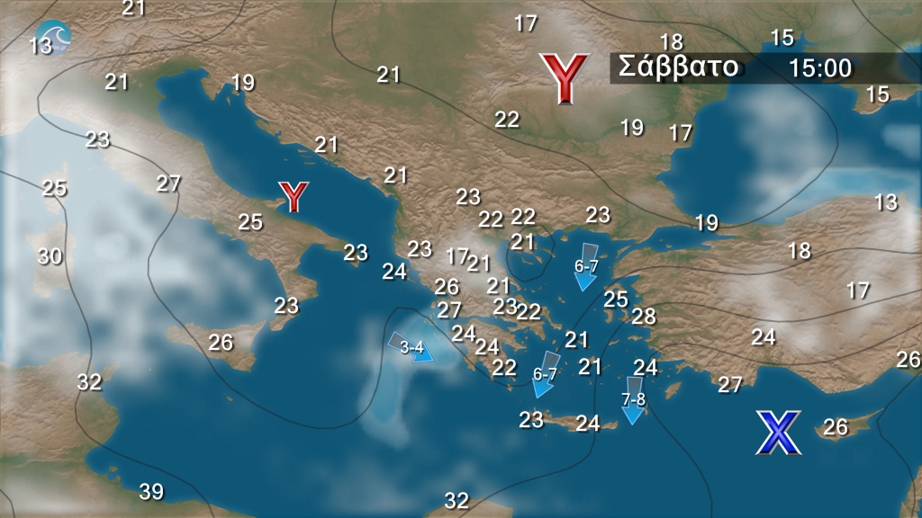 Οι άνεμοι θα πνέουν από βόρειες διευθύνσεις, στα δυτικά 3 με 4, στα ανατολικά 4 με 6 και στο Αιγαίο τοπικά 7 μποφόρ με μικρή εξασθένηση από το βράδυ. Η θερμοκρασία δεν θα σημειώσει αξιόλογη μεταβολή.