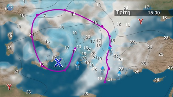 Οι άνεμοι θα πνέουν στα δυτικά από νότιες και στα ανατολικά από ανατολικές διευθύνσεις 4 με 6 μποφόρ. Η θερμοκρασία δεν θα σημειώσει αξιόλογη μεταβολή.