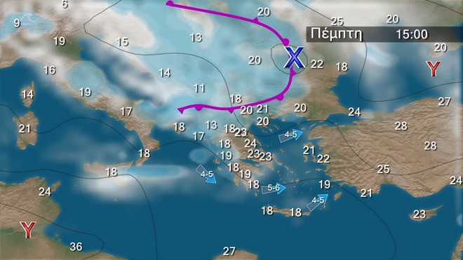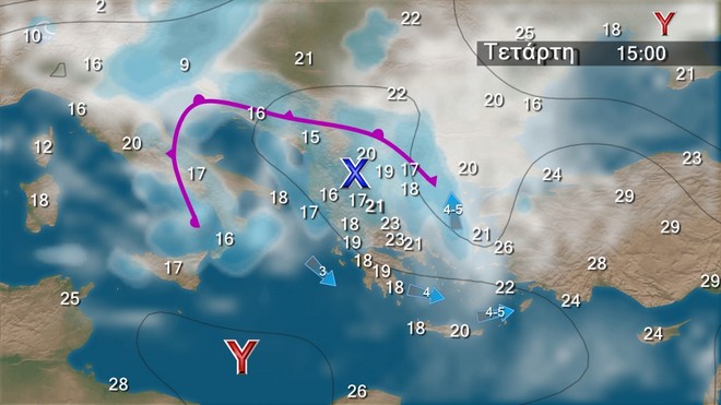Οι άνεμοι θα πνέουν στα δυτικά από νότιες και στα νότια από δυτικές διευθύνσεις 3 με 5 μποφόρ. Στις υπόλοιπες περιοχές θα είναι μεταβλητοί 3 με 4 μποφόρ. Η θερμοκρασία δεν θα σημειώσει αξιόλογη μεταβολή.
