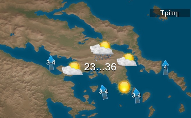 Στην Αττική προβλέπεται γενικά αίθριος καιρός . Τις απογευματινές ώρες θα αναπτυχθούν πρόσκαιρες νεφώσεις και είναι πιθανόν να εκδηλωθούν τοπικοί όμβροι στα βόρεια. Οι άνεμοι θα πνέουν νοτιοανατολικοί 3 με 4 και από το απόγευμα δυτικοί βορειοδυτικοί 5 μποφόρ. Η θερμοκρασία θα κυμανθεί από 23 έως 36 βαθμούς Κελσίου.