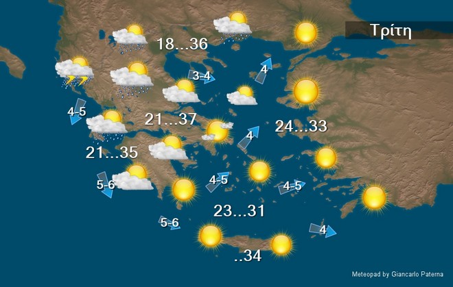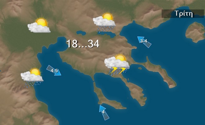 Την Τρίτη αρχικά στο βόρειο Ιόνιο και την Ήπειρο και βαθμιαία και στα υπόλοιπα δυτικά και βόρεια ηπειρωτικά αυξημένες νεφώσεις με τοπικούς όμβρους και σποραδικές καταιγίδες, οι οποίες στο βόρειο Ιόνιο και κυρίως στην περιοχή Κέρκυρας-Παξών πιθανώς μέχρι το μεσημέρι να είναι πρόσκαιρα ισχυρές. Βαθμιαία εξασθένηση των φαινομένων τις βραδινές ώρες από τα δυτικά.