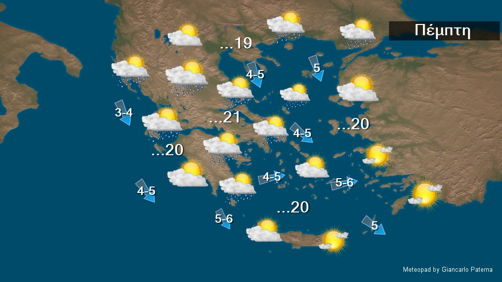 Στα ηπειρωτικά λίγες νεφώσεις που βαθμιαία θα αυξηθούν και θα εκδηλωθούν τοπικές βροχές και μεμονωμένες καταιγίδες κυρίως στα ορεινά. Στο τέλος της ημέρας τα φαινόμενα θα περιοριστούν στα ανατολικά τμήματα. Στις υπόλοιπες περιοχές λίγες νεφώσεις τοπικά στα νότια αυξημένες με τοπικές βροχές στις Κυκλάδες και την Κρήτη. Οι άνεμοι θα πνέουν βόρειοι βορειοανατολικοί 3 με 5 μποφόρ και στα νοτιοδυτικά τοπικά έως 6 μποφόρ. Η θερμοκρασία δεν θα σημειώσει αξιόλογη μεταβολή.
