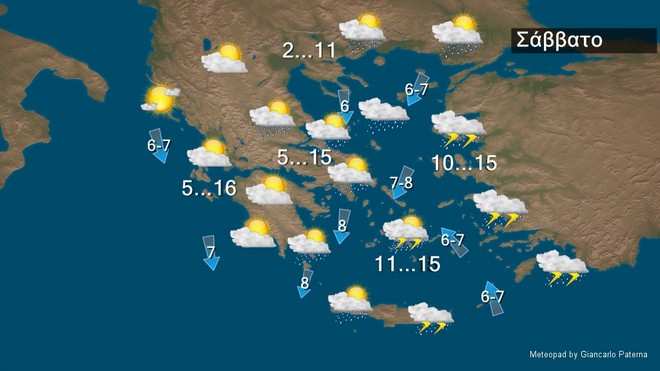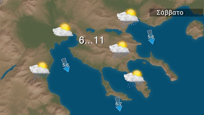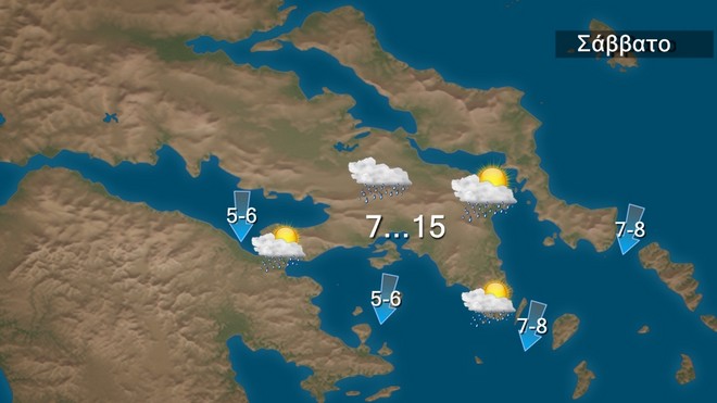 Το Σάββατο ο καιρός θα παρουσιάσει σταδιακή βελτίωση στα δυτικά από το μεσημέρι, ενώ στις υπόλοιπες περιοχές θα έχουμε βροχές και σποραδικές καταιγίδες πιθανώς κατά τόπους ισχυρές στα νησιά του ανατολικού Αιγαίου και τα Δωδεκάνησα. Πρόσκαιρες χιονοπτώσεις θα σημειωθούν στα ηπειρωτικά ορεινά και από το απόγευμα και στα ορεινά της Κρήτης. Βαθμιαία τα φαινόμενα θα περιοριστούν στα ανατολικά και τα νότια και θα εξασθενήσουν. Σταδιακή επικράτηση βορείων ανέμων και στο Αιγαίο, που θα φθάνουν τοπικά τα 8 μποφόρ.. Η θερμοκρασία θα σημειώσει πτώση αλλά παρόλα αυτά θα παραμείνει σε επίπεδα πάνω από τα κανονικά και θα έχουμε μέγιστη θερμοκρασία στα βόρεια τους 11 βαθμούς, στα υπόλοιπα ηπειρωτικά και το Ιόνιο τους 15 με 16 βαθμούς και στο Αιγαίο τους 15 βαθμούς Κελσίου.