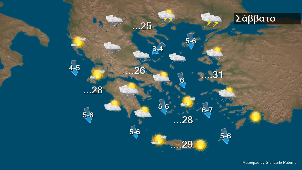 Στη Μακεδονία, τη Θράκη, την Ήπειρο, το Ιόνιο, τη Θεσσαλία, τη Στερεά, την Πελοπόννησο, τις Σποράδες, το βόρειο Αιγαίο και την Κρήτη τοπικές νεφώσεις παροδικά αυξημένες με τοπικές βροχές και σποραδικές καταιγίδες κυρίως στα ηπειρωτικά τις μεσημβρινές και απογευματινές ώρες. Τα φαινόμενα στα ηπειρωτικά, την Εύβοια, τις Σποράδες και τα νησιά του βορείου Αιγαίου, θα είναι κατά τόπους ισχυρά. Στις υπόλοιπες περιοχές λίγες νεφώσεις. Οι άνεμοι θα πνέουν από βόρειες διευθύνσεις στα δυτικά 4 με 6, στο βόρειο Ιόνιο τοπικά έως 7 μποφόρ και στο Αιγαίο 5 με 6 και τοπικά στο κεντρικό και βόρειο έως 7 μποφόρ . Η θερμοκρασία θα σημειώσει πτώση κυρίως στα βόρεια όπου θα φτάσει τους 23 με 26 βαθμούς, στα υπόλοιπα ηπειρωτικά τους 26 με 28 και στη νησιωτική χώρα τους 29 με 31 βαθμούς Κελσίου.