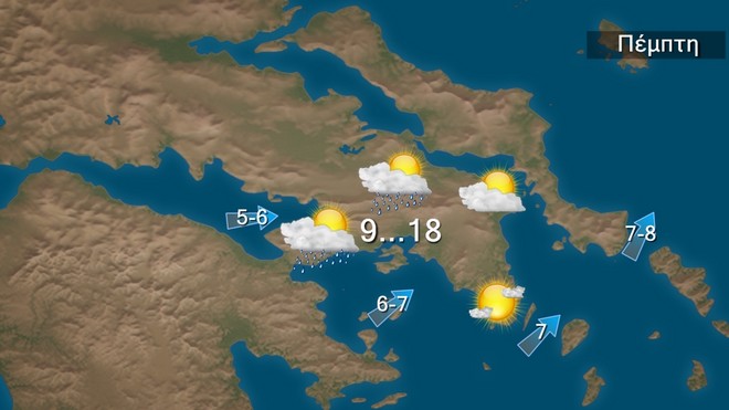 Την Πέμπτη αρχικά στα δυτικά, βαθμιαία στις υπόλοιπες ηπειρωτικές περιοχές και από το απόγευμα στα νησιά του ανατολικού Αιγαίου προβλέπονται βροχές και σποραδικές καταιγίδες. Τα φαινόμενα πιθανώς να είναι κατά τόπους ισχυρά, στα δυτικά μέχρι τις μεσημβρινές ώρες και στην ανατολική Μακεδονία, τη Θράκη και τα νησιά του βορείου και τα νησιά του ανατολικού Αιγαίου από το απόγευμα. Παροδικές χιονοπτώσεις θα σημειωθούν στα ηπειρωτικά ορεινά της κεντρικής και βόρειας χώρας. Ευνοείται η μεταφορά αφρικανικής σκόνης. Οι άνεμοι θα πνέουν νότιοι νοτιοδυτικοί 6 με 7 και στα πελάγη τοπικά 8 μποφόρ. Βαθμιαία από τις μεσημβρινές ώρες και από τα δυτικά θα στραφούν σε δυτικούς βορειοδυτικούς και θα εξασθενήσουν. Η θερμοκρασία θα σημειώσει μικρή πτώση στα δυτικά και τα βόρεια και θα έχει μέγιστη τιμή στα βόρεια τους 17 βαθμούς, στα υπόλοιπα ηπειρωτικά και το Ιόνιο τους 18 με 19 βαθμούς Κελσίου, στις Κυκλάδες και την Κρήτη τους 20 βαθμούς και στο Ανατολικό Αιγαίο και τα Δωδεκάνησα τους 20 βαθμούς Κελσίου.