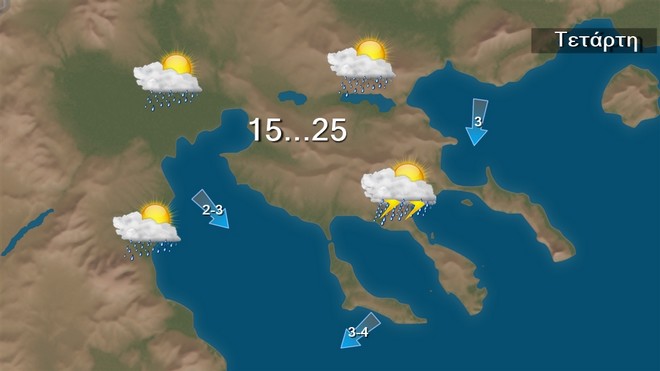 Την Τετάρτη προβλέπονται σποραδικοί όμβροι ή καταιγίδες αρχικά στα θαλάσσια-παραθαλάσσια της κεντρικής Μακεδονίας, την ανατολική Θεσσαλία και τις Σποράδες, ενώ τις μεσημβρινές – απογευματινές ώρες θα βρέξει και στα υπόλοιπα ηπειρωτικά και την Κρήτη. Στην υπόλοιπη χώρα θα επικρατήσει αρχικά αίθριος καιρός με πρόσκαιρους όμβρους το μεσημέρι-απόγευμα.