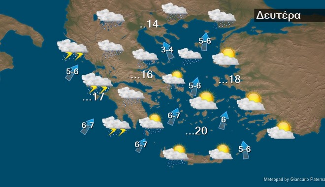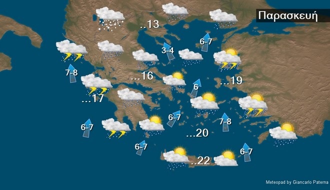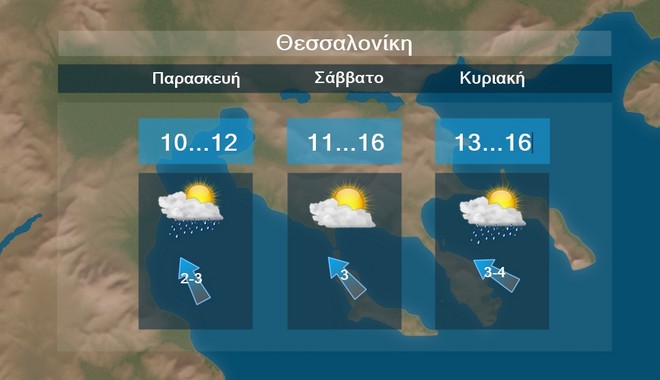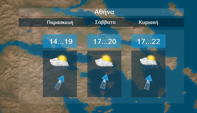 Στη δυτική χώρα προβλέπονται βροχές και καταιγίδες κατά τόπους ισχυρές. Στην υπόλοιπη χώρα νεφώσεις με τοπικές βροχές και στην ανατολική Πελοπόννησο, τη δυτική Κρήτη και βαθμιαία στα υπόλοιπα ηπειρωτικά, το κεντρικό και το βόρειο Αιγαίο μεμονωμένες καταιγίδες που βαθμιαία θα ενταθούν. Τα φαινόμενα από το απόγευμα και από τα δυτικά θα εξασθενήσουν και το βράδυ θα περιοριστούν στο βορειοανατολικό Αιγαίο και τη Θράκη. Πρόσκαιρες χιονοπτώσεις θα εκδηλωθούν στα ορεινά της βόρειας και κεντρικής Ελλάδας. Ευνοείται η μεταφορά σκόνης κυρίως στα νότια. Οι άνεμοι στα δυτικά θα πνέουν νότιοι νοτιοανατολικοί 6 με 8 και πιθανώς στο Ιόνιο τοπικά 9 μποφόρ, που βαθμιαία θα εξασθενήσουν και θα στραφούν σε δυτικούς νοτιοδυτικούς 4 με 6 μποφόρ. Στα ανατολικά θα πνέουν ανατολικοί νοτιοανατολικοί 3 με 5, που γρήγορα θα στραφούν σε νότιους 5 με 7 και στο Αιγαίο πρόσκαιρα έως 8 μποφόρ. Η θερμοκρασία στα βόρεια θα φτάσει τους 10 με 13 βαθμούς, στα υπόλοιπα ηπειρωτικά και στα νησιά του Ιονίου τους 18 με 20 βαθμούς και στην ανατολική νησιωτική χώρα τους 20 με 22 βαθμούς Κελσίου.