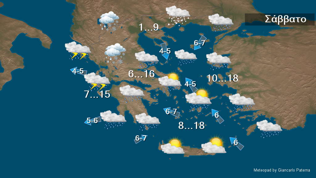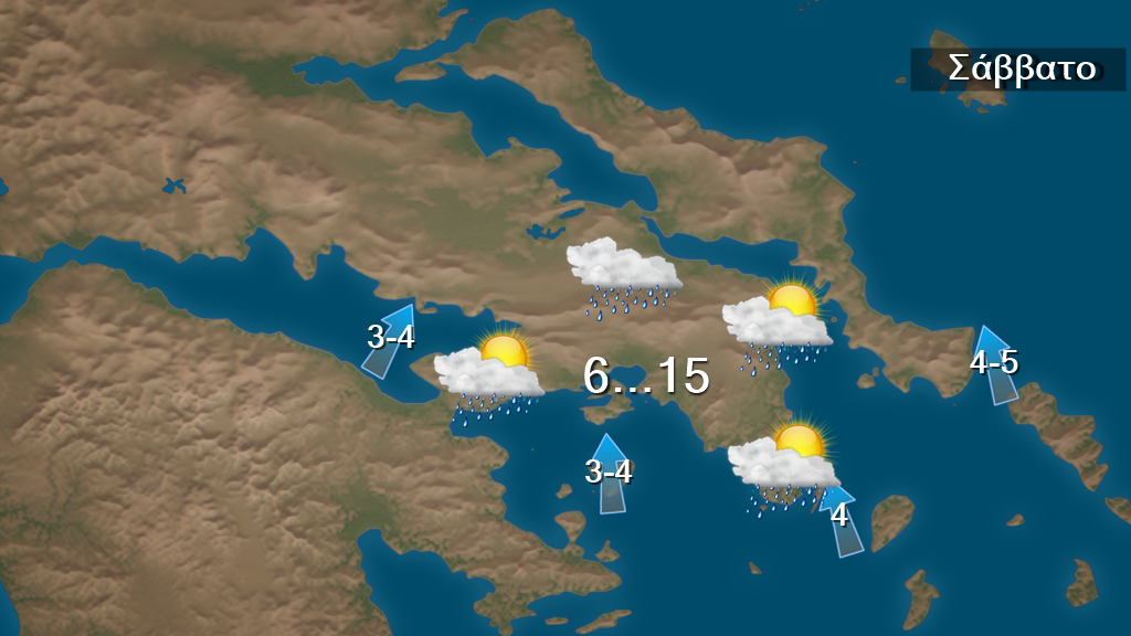 Το Σάββατο προβλέπονται τοπικές βροχές και σποραδικές καταιγίδες κυρίως στα θαλάσσια παραθαλάσσια και χιονοπτώσεις στα κεντρικά και βόρεια ορεινά. Τα φαινόμενα στη δυτική και βόρεια χώρα θα είναι κατά τόπους έντονα.