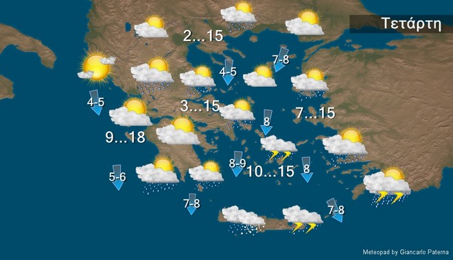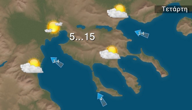 Χιονοπτώσεις θα σημειωθούν στα ηπειρωτικά ορεινά , ενώ το θα χιονίσει και στα ορεινά της Κρήτης . Το βράδυ τα φαινόμενα θα περιοριστούν στις Κυκλάδες, την Κρήτη και τα Δωδεκάνησα. Οι άνεμοι θα πνέουν, στα δυτικά από ανατολικές διευθύνσεις 4 με 6 μποφόρ, στα ανατολικά βόρειοι βορειοανατολικοί 6 με 7 και στο Αιγαίο 8 με 9 μποφόρ. Η θερμοκρασία θα σημειώσει πτώση στα ανατολικά και τα νότια κατά 4 περίπου βαθμούς και θα έχει μέγιστη τιμή στα βόρεια τους 15 βαθμούς Κελσίου, στα υπόλοιπα ηπειρωτικά και το Ιόνιο τους 15 με 18 βαθμούς, στις Κυκλάδες και την Κρήτη τους 15 και στο Ανατολικό Αιγαίο και Δωδεκάνησα τους 15 βαθμούς Κελσίου.