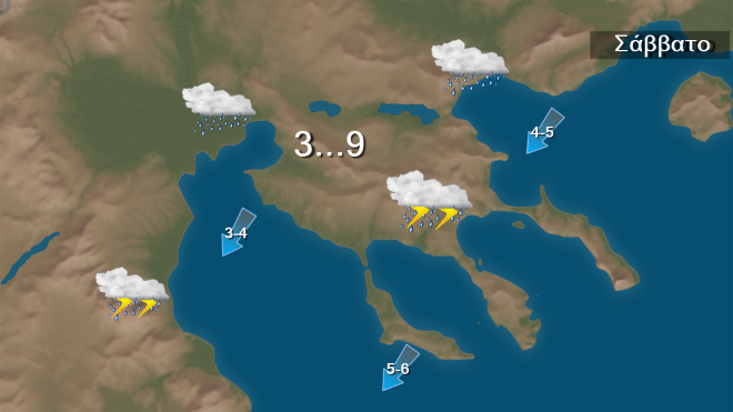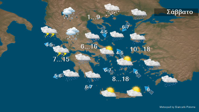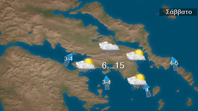 Σήμερα Σάββατο προβλέπονται τοπικές βροχές και σποραδικές καταιγίδες κυρίως στα θαλάσσια παραθαλάσσια και χιονοπτώσεις στα κεντρικά και βόρεια ορεινά. Τα φαινόμενα στη δυτική και βόρεια χώρα θα είναι κατά τόπους έντονα. Οι μετεωρολογικές συνθήκες ευνοούν τη μεταφορά αφρικανικής σκόνης στα νότια. Οι άνεμοι θα πνέουν από νότιες διευθύνσεις 3 με 5 και από τις βραδινές ώρες στο νότιο Αιγαίο τοπικά 6 μποφόρ και μόνο στα βορειοανατολικά θα πνέουν ανατολικοί βορειοανατολικοί 3 με 5 και από το απόγευμα στο βόρειο Αιγαίο 6 τοπικά 7 μποφόρ. Η θερμοκρασία θα σημειώσει πτώση στα βόρεια και δεν θα ξεπεράσει στην Ήπειρο, τη Μακεδονία, τη Θράκη και τη Θεσσαλία τους 7 με 9 βαθμούς, ενώ στα νότια θα σημειώσει μικρή άνοδο και στην Κρήτη, τις Κυκλάδες και τα Δωδεκάνησα θα φτάσει τους 16 με 18 βαθμούς Κελσίου. Παγετός θα σημειωθεί τις πρωινές και βραδινές ώρες κατά τόπους στα βόρεια ηπειρωτικά.