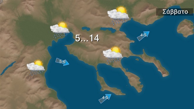 Το Σάββατο προβλέπονται νεφώσεις με τοπικές βροχές και σποραδικές καταιγίδες στα δυτικά τις πρωινές ώρες και στη Θράκη, τα νησιά του ανατολικού Αιγαίου και τα Δωδεκάνησα μέχρι το απόγευμα. Ο καιρός θα βελτιωθεί γρήγορα στο Ιόνιο και τις περισσότερες ηπειρωτικές περιοχές και από το απόγευμα και στην υπόλοιπη χώρα. Οι άνεμοι θα πνέουν νοτιοδυτικοί 5 με 7 και στο νότιο Αιγαίο πρόσκαιρα 8 μποφόρ, στρεφόμενοι βαθμιαία από τις προμεσημβρινές ώρες σε δυτικούς βορειοδυτικούς, με σταδιακή εξασθένηση. Η θερμοκρασία θα σημειώσει νέα άνοδο και θα έχει μέγιστη τιμή στα βόρεια τους 14 βαθμούς, στα υπόλοιπα ηπειρωτικά και το Ιόνιο τους 18 με 19 βαθμούς Κελσίου, στις Κυκλάδες και την Κρήτη τους 19 βαθμούς και στο Ανατολικό Αιγαίο και τα Δωδεκάνησα τους 19 βαθμούς Κελσίου.