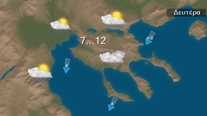 Τη Δευτέρα σε όλη τη χώρα προβλέπονται νεφώσεις, με βροχές κυρίως στα κεντρικά και ανατολικά ηπειρωτικά και το ανατολικό Αιγαίο, όπου στα Δωδεκάνησα θα εκδηλωθούν και καταιγίδες..Οι άνεμοι θα πνέουν ανατολικοί βορειοανατολικοί 4 με 6 μποφόρ και στα Δωδεκάνησα νοτιοανατολικοί 4 με 5 μποφόρ.